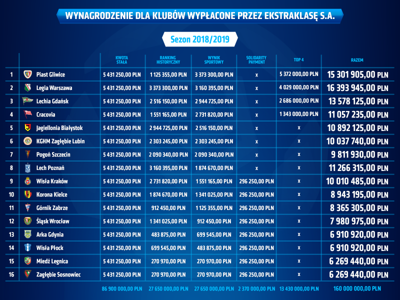 „Jeszcze przed startem nowego sezonu mamy dobrą wiadomość dla klubów. Oprócz zabudżetowanych na początku sezonu i wypłaconych w maju 155 mln zł, wygospodarowaliśmy jeszcze 5 mln zł, które właśnie przekazaliśmy klubom. To efekt dodatkowych projektów sponsorskich z LOTTO i PKO BP, w ramach których marki te były promowane w naszej oficjalnej aplikacji mobilnej. Przychody te pochodzą także z współpracy nawiązanej z KFC i Media Expert w zakresie rozgrywek e-sportowych Ekstraklasa Games. Na tę sumę złożyły się też oszczędności w kosztach operacyjnych i ogólnego zarządu oraz środki uwolnione dzięki skutecznemu i korzystnemu rozwiązaniu umowy z MP & Silva” – komentuje Marcin Animucki, prezes zarządu Ekstraklasy S.A., cytowany w komunikacie.