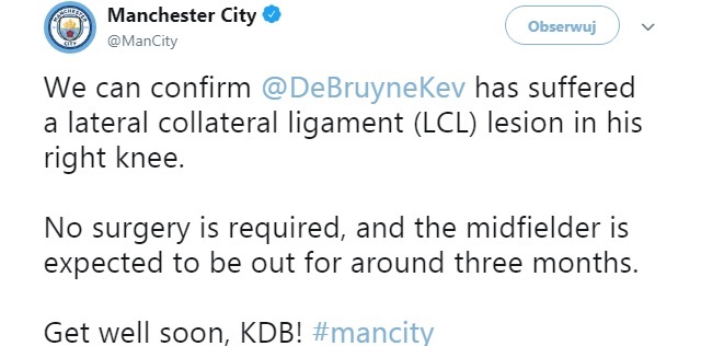 Manchester City może potwierdzić, że Kevin De Bruyne doznał uszkodzenia bocznego więzadła strzałkowego (LCL) w prawym kolanie – poinformowano w piątek w oficjalnym komunikacie prasowym klubu.