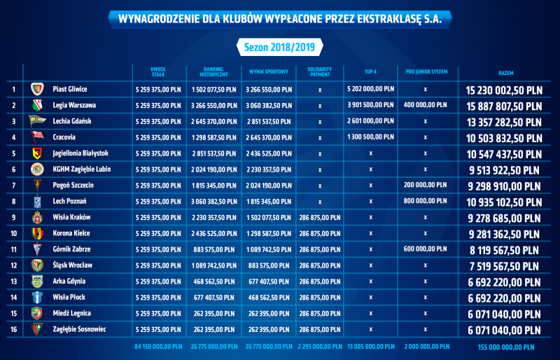 „Wojskowi” zgarnęli w sumie niespełna 16 milionów, a swoją przewagę nad zespołami z pierwszej i trzeciej pozycji zawdzięczają najlepszemu rankingowi historycznemu, który jest jednym z kryteriów podziału. „Piastunki” otrzymały nieco ponad 15 mln, a „Lechiści” blisko 2 mln złotych mniej.