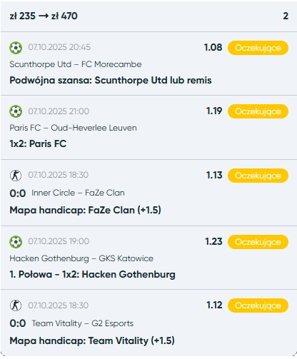 W przypadku braku konta w STS można je założyć dosłownie w kilka chwil. Z kodem promocyjnym "BETONLINE" jest do odebrania 29 PLN bez depozytu. Oprócz tego zgarnąć można jeszcze nawet 1200 PLN przy II depozycie. To wszystko w ramach oferty specjalnej, czyli tak zwanego pakietu powitalnego dla nowo zarejestrowanych.