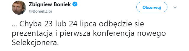 „...Chyba 23 lub 24 lipca odbędzie się prezentacja i pierwsza konferencja nowego Selekcjonera” - napisał szef Polskiego Związku Piłki Nożnej na Twitterze.