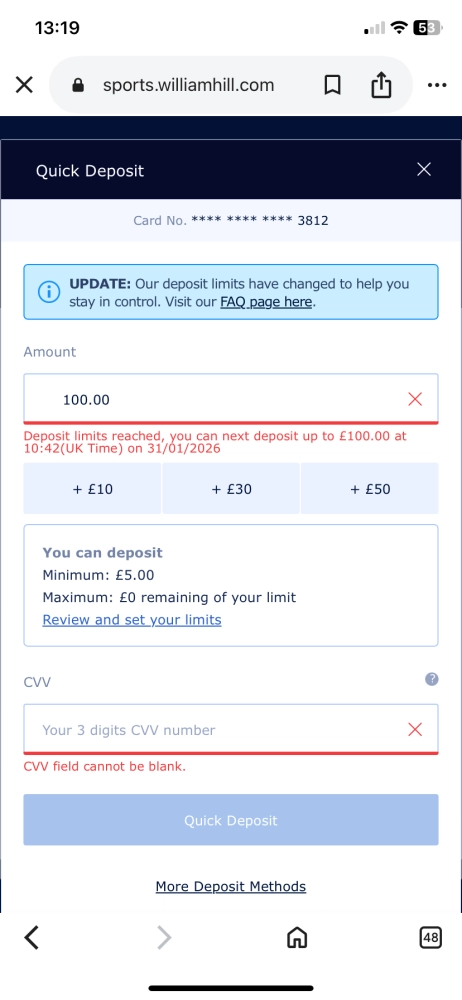 Łaskawie WILLIAM HILL odblokował mi konto. Mój limit ktory mogę załadować to £100. Tak zrobiłem i już przekroczyłem limit 😂. Za te £100 będę grał ostrożnie i ich nękał dzień w dzień wyciągając od nich po £20 / £30. Za to że tacy fajfusy są 🤬