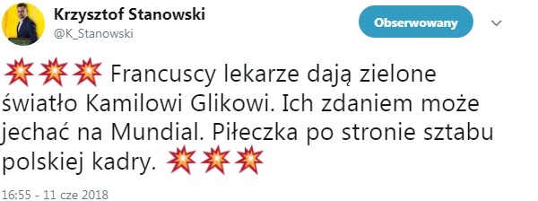 Jak poinformował na Twitterze Krzysztof Stanowski z portalu „WESZŁO” (weszlo.com), Kamil Glik otrzymał zgodę francuskich lekarzy na udział w Mistrzostwach Świata w Rosji!